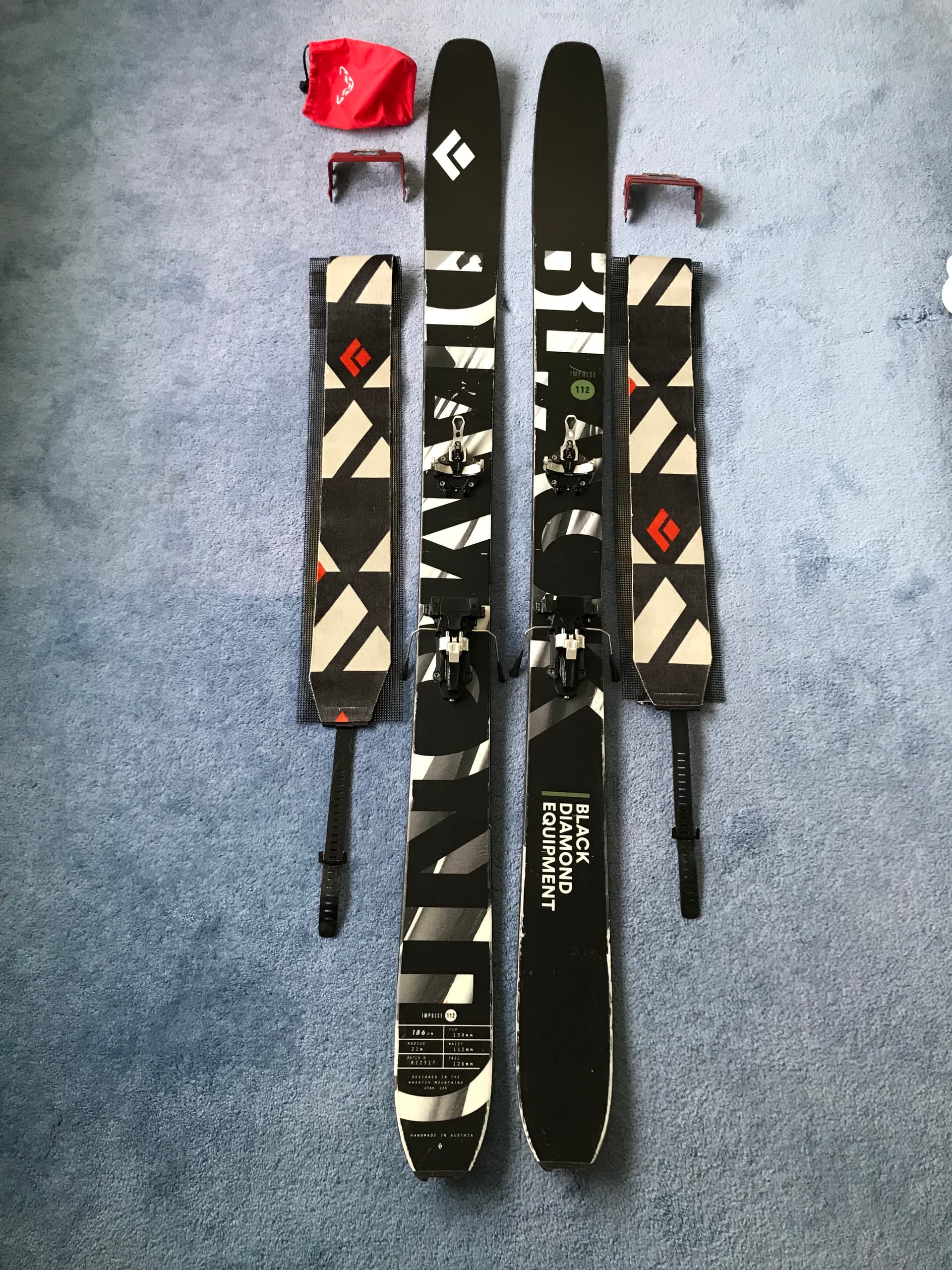Impulse 112s, 186cm with ATK R12 bindings with Black Diamond Glidelite Mix STS skins and ATK RA Crampons.